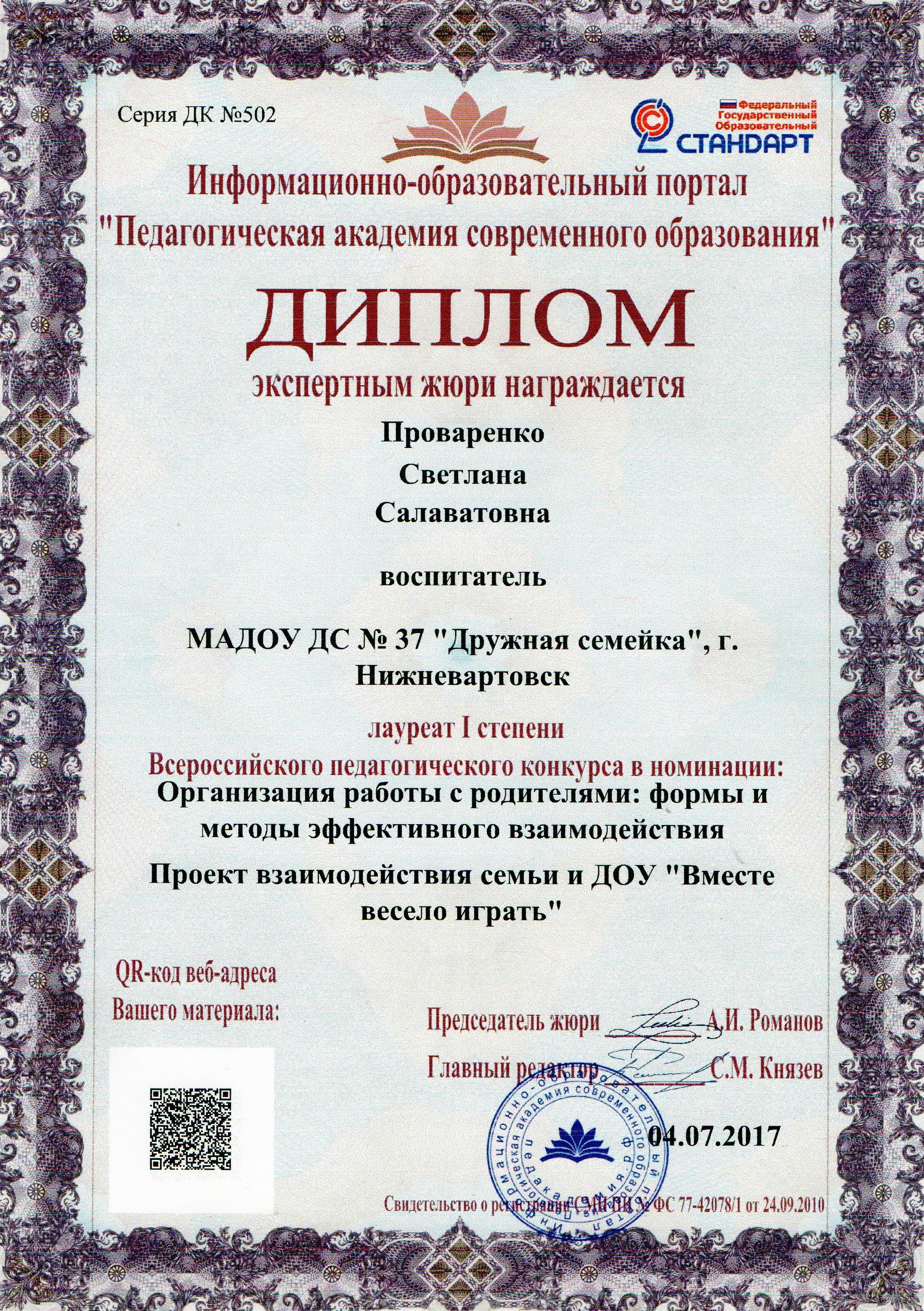 Диплом лауреат 1 степени всероссийского педагогического конкурса "Проект взаимодействия с семьей "Вместе весело играть", 2017 г. (Просмотр)