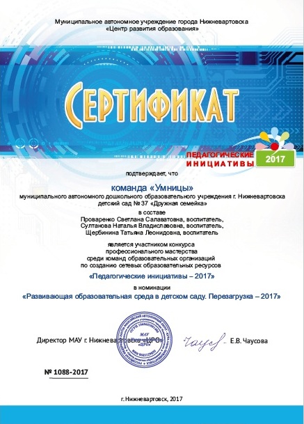 Сертификат участника конкурса профессионального мастерства среди педагогов образовательных организаций по созданию цифровых образовательных ресурсов «А я делаю так - 2017!» в номинации «Лучший цифровой образовательный ресурс для дошкольников - 2017». Нижневартовск (Просмотр)