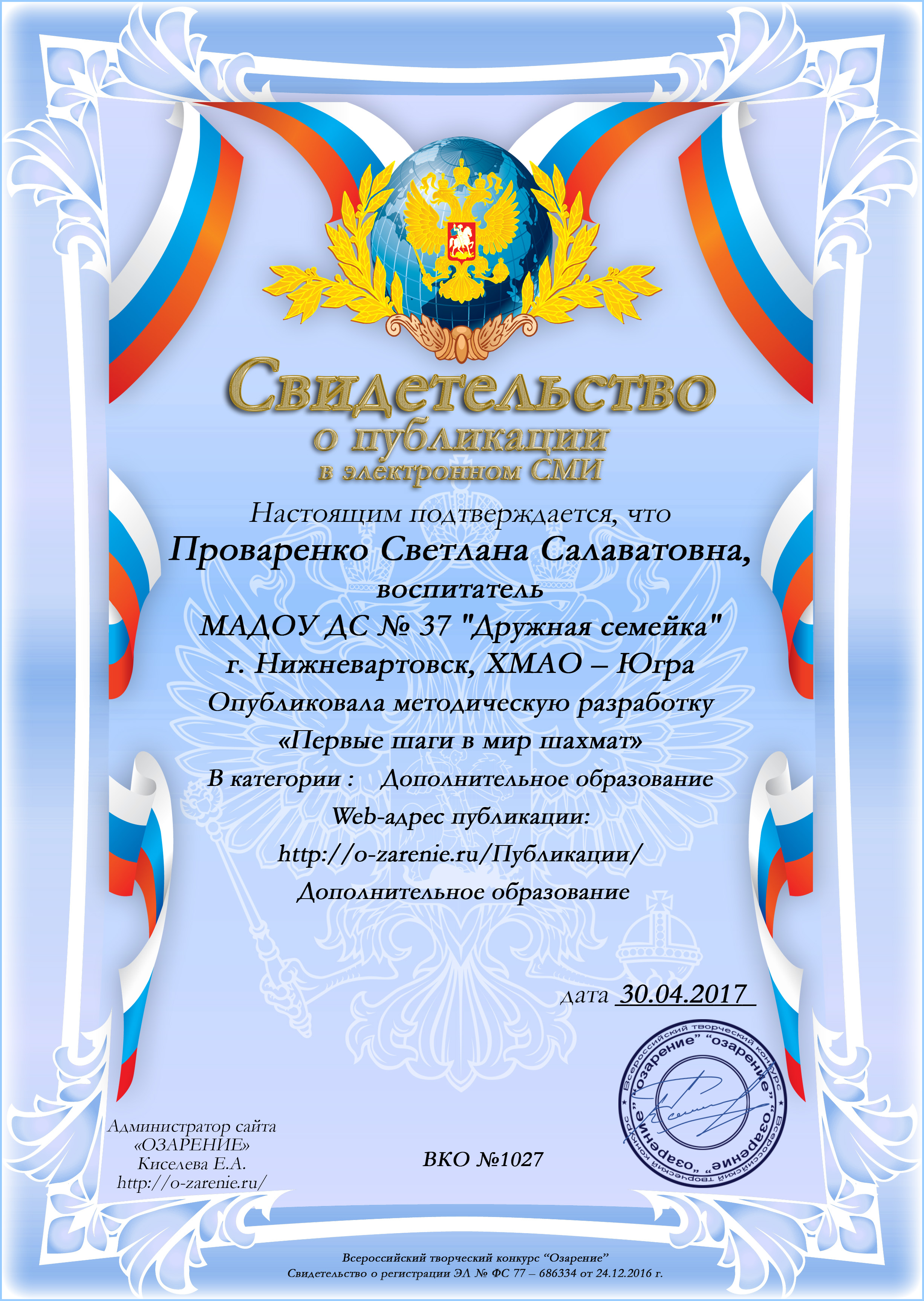 Свидетельство о публикации "Первые шаги в мир шахмат" в категории Дополнительное образование. №1027, 2017 год (Просмотр)