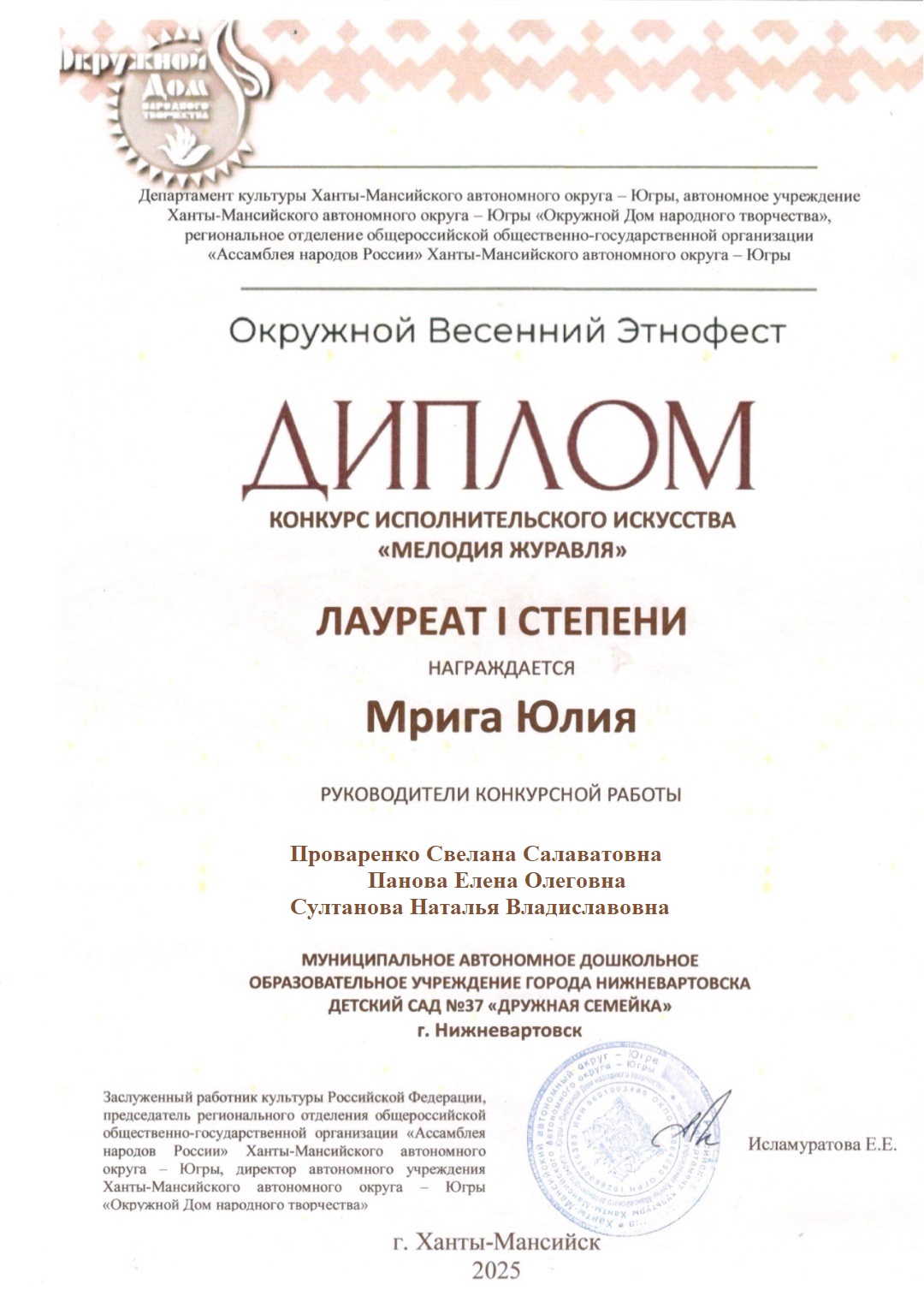 | Лауреат 1 степени «Окружной весенний этнофест» конкурс исполнительного искусства «Мелодия журавля» (Просмотр) | ||