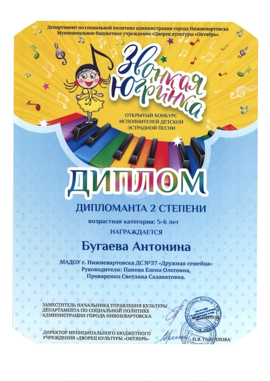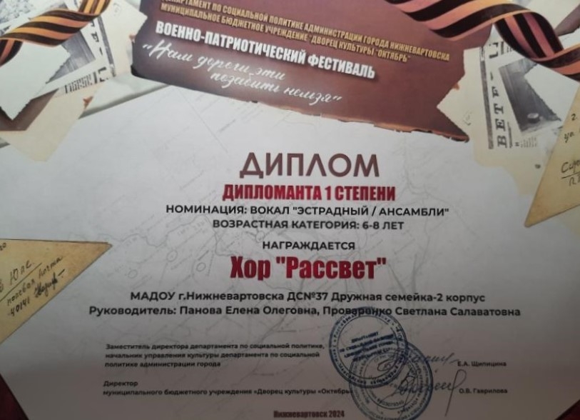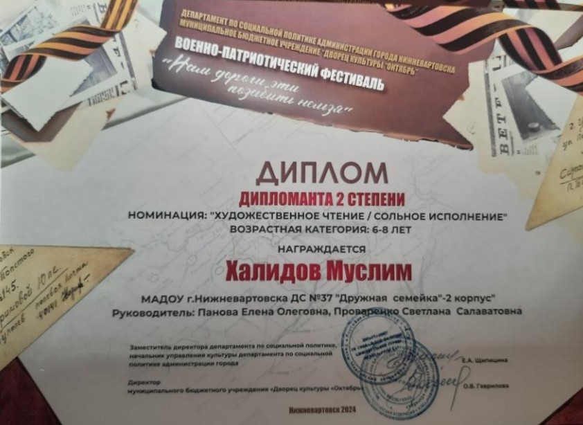 Диплом II степени городского фестиваля военной песни "Две звезды", в номинации "Песни военных лет" (Просмотр) Диплом лауреата III степени фестиваля-конкурса детского и юношеского творчества "Самотлорские роднички" в номинации Вокал «Соло 6-7 лет(Просмотр) Диплом 1 место Военно-патриотический фестиваль "Нам дороги эти позабыть нельзя" ХОР "Рассвет"(Просмотр) Диплом 2 место Военно-патриотический фестиваль "Нам дороги эти позабыть нельзя" конкурс чтецов (Просмотр) Диплом лауреата 2 степени «Звонкая Югринка», 2025г. (Просмотр) Диплом 1 место "Технофорум" 5 выставка конкурс технического творчества (Просмотр) Диплом 1 степени всесезонный фестиваль «Времена года» «Маленькая осень» в номинации художественное слово «Озорники» (Просмотр) (Просмотр)(Просмотр) (Просмотр) Диплом 1 степени всесезонный фестиваль «Времена года» «Маленькая зима» в номинации «Танец Снежинок» (Просмотр) (Просмотр) (Просмотр) Диплом специальный приз жюри в городском интернет-конкурсе детского творчества »Про маму и папу» направление «Песня» (Просмотр) Диплом 1 степени всесезонный фестиваль «Времена года» «Маленькая Весна» «Родничок» (Просмотр)» (Просмотр) (Просмотр) (Просмотр) (Просмотр) (Просмотр) Диплом лауреата 3 степени «Звонкая Югринка», 2023г. (Просмотр) |