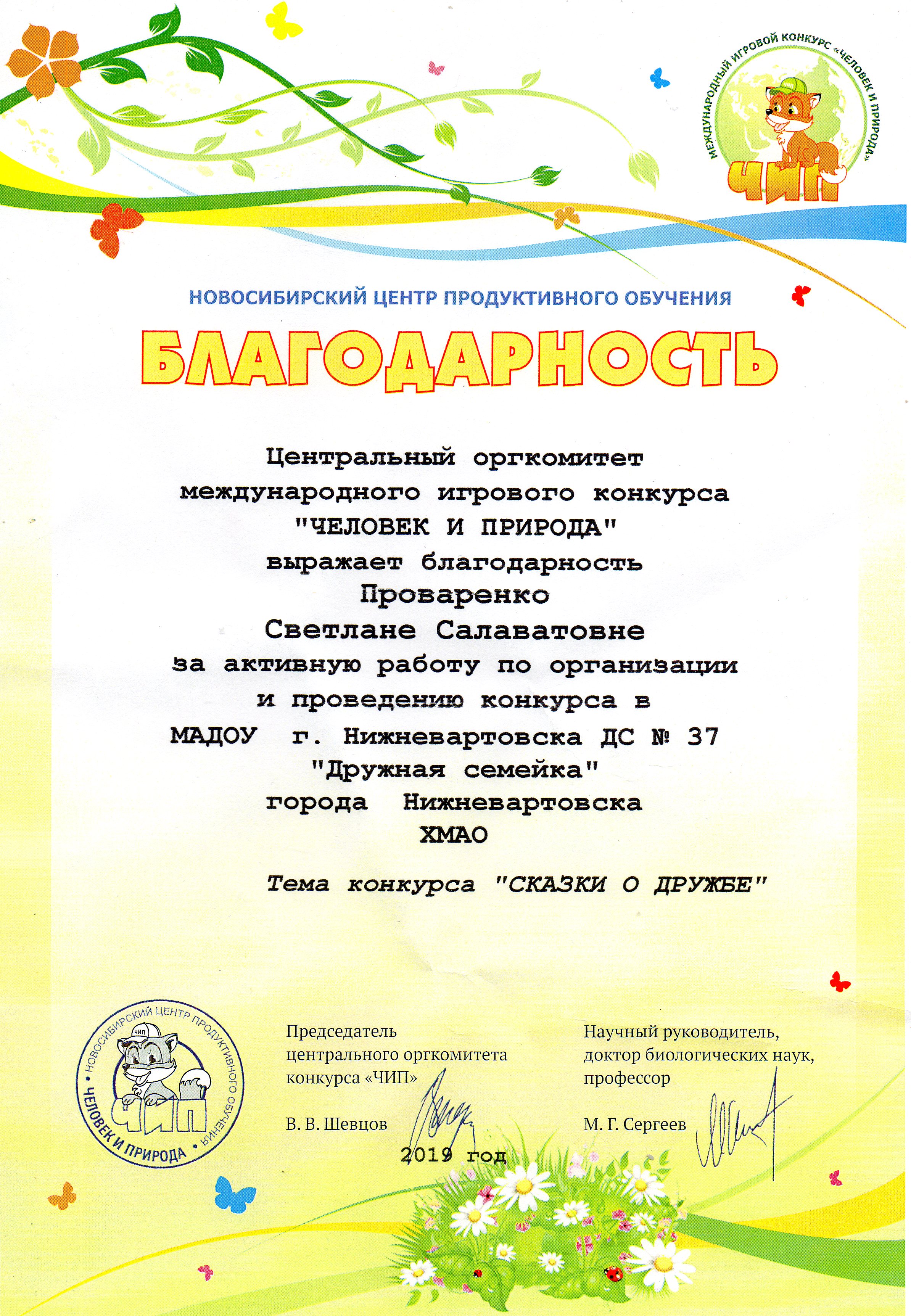 Благодарность за активную работу по организации и проведения международного игрового конкурса "Человек и природа" 2019 (Просмотр)