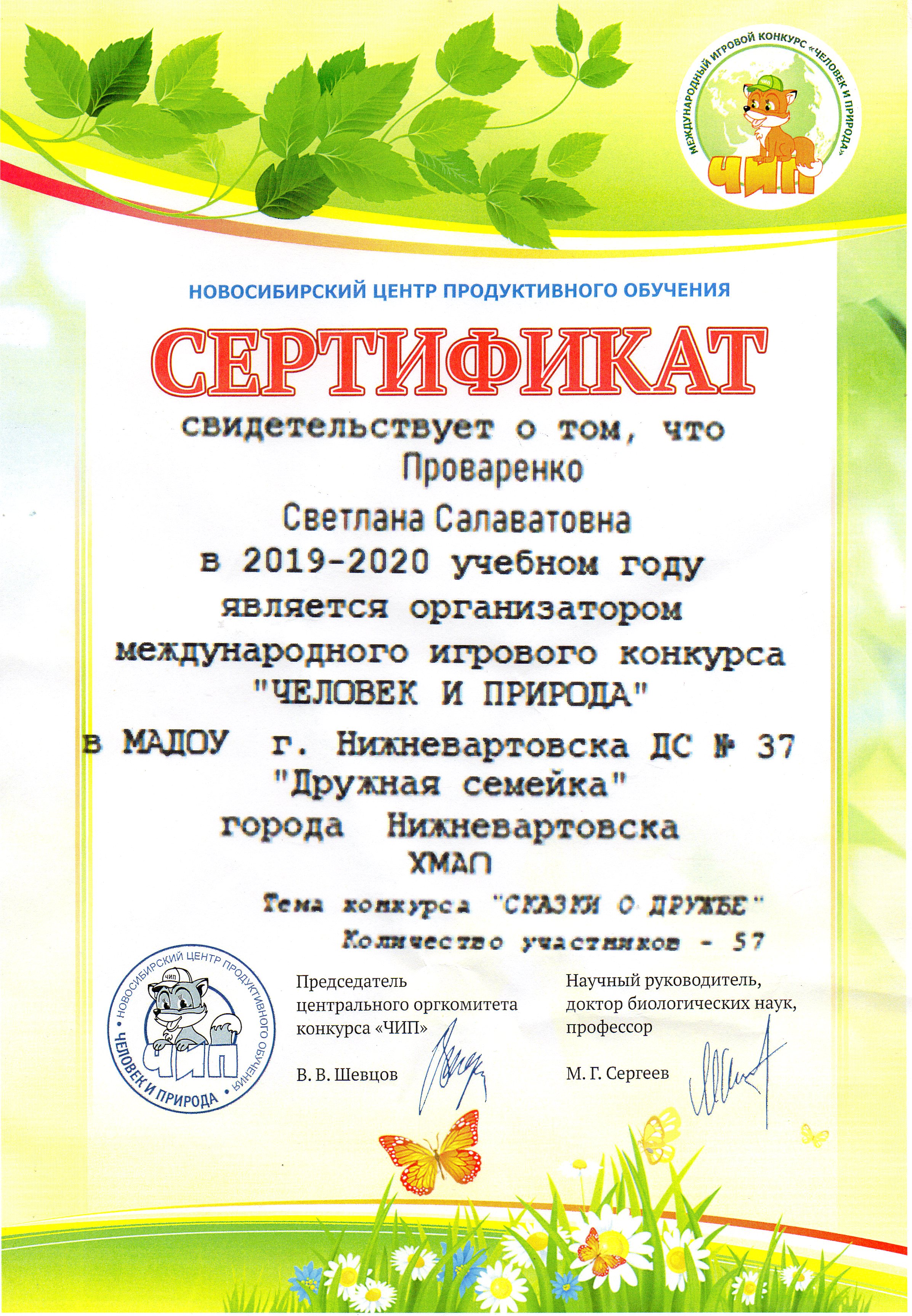 Сертификат организатора проведения международного игрового конкурса "Человек и природа" 2019 (Просмотр)