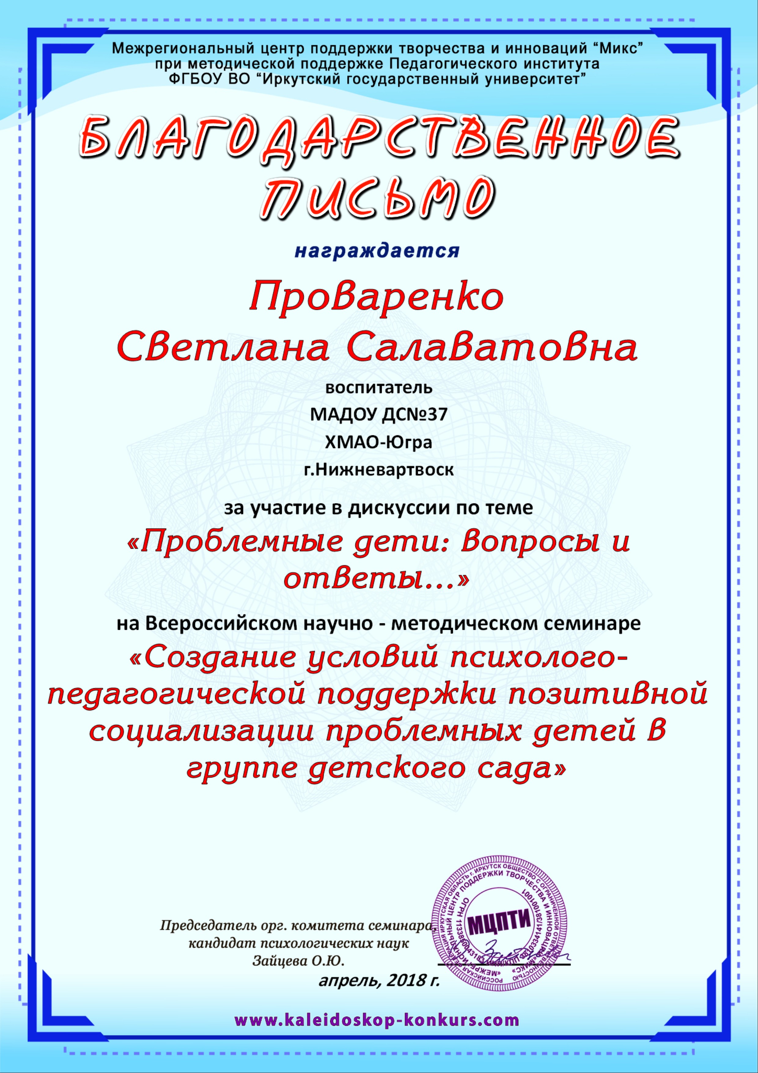 Благодарственное письмо за участие в дискуссии по теме "Проблемные дети: вопросы и ответы..." на Всероссийском научно-методическом семинаре "Создание условий психолого-педагогической поддержки позитивной социализации проблемных детей в группе детского сада", 2018 год (Просмотр)