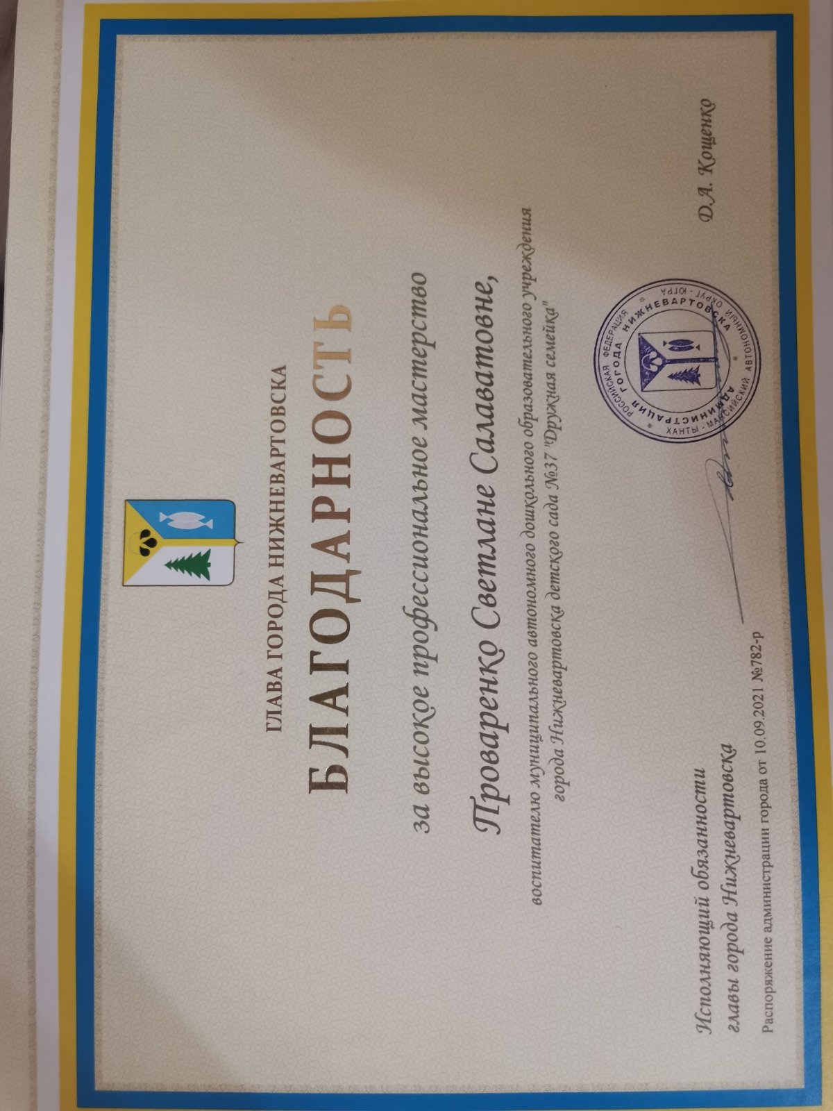 Благодарность главы города Нижневартовска за высокое профессиональное мастерство, 2021 (Просмотр)