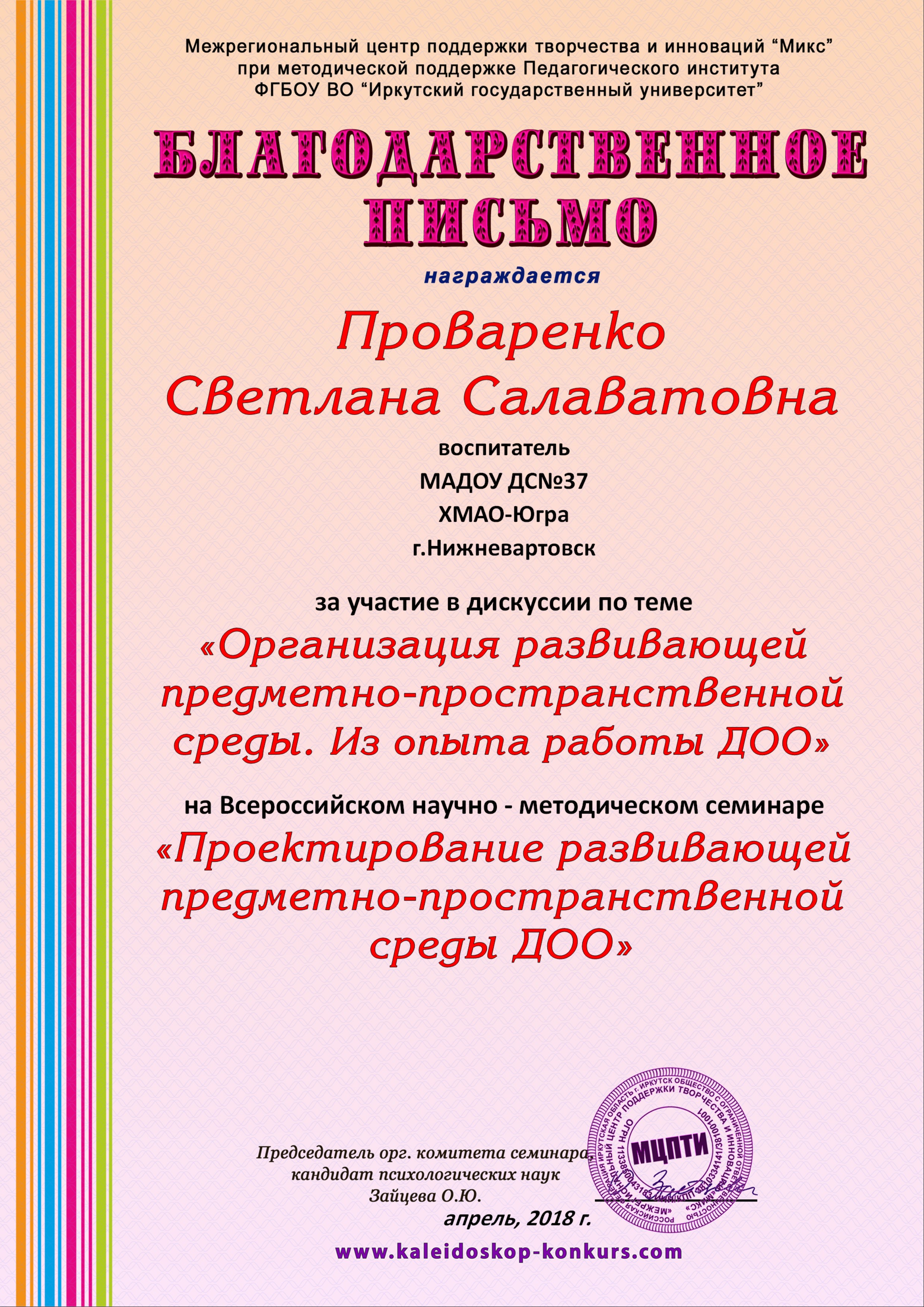 Благодарственное письмо за участие в дискуссии по теме "Организация развивающей предметно-пространственной среды. Из опыта работы ДОО" на Всероссийском научно-методическом семинаре "Проектирование развивающей предметно-пространственной среды ДОО", 2018 год (Просмотр)