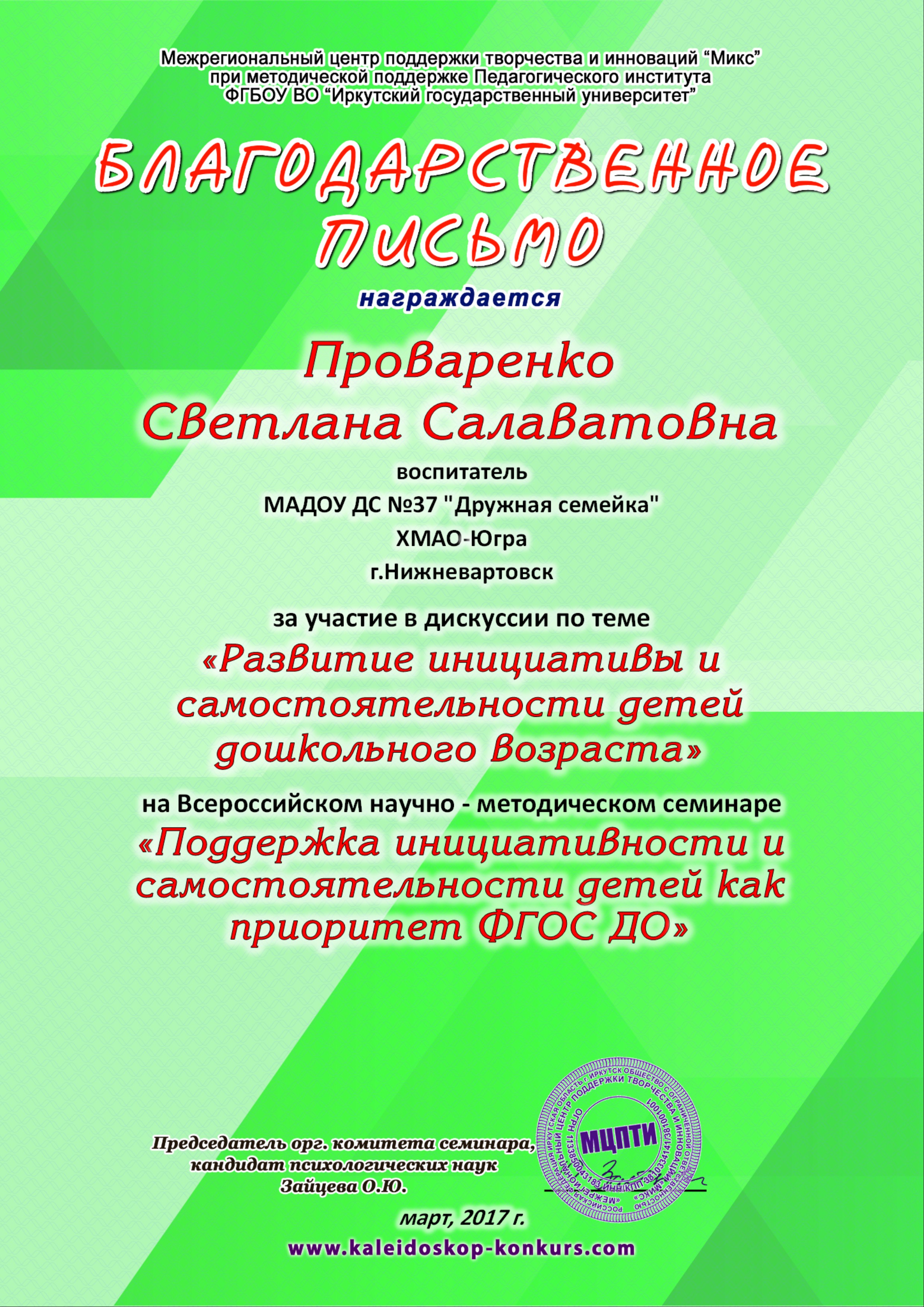 Благодарственное письмо за участие в дискуссии по теме "Развитие инициативности и самостоятельности детей дошкольного возраста" на Всероссийском научно-методическом семинаре "Поддержка инициативности и самостоятельности детей как приоритет ФГОС ДО" (8ч.), 2017 год (Просмотр)