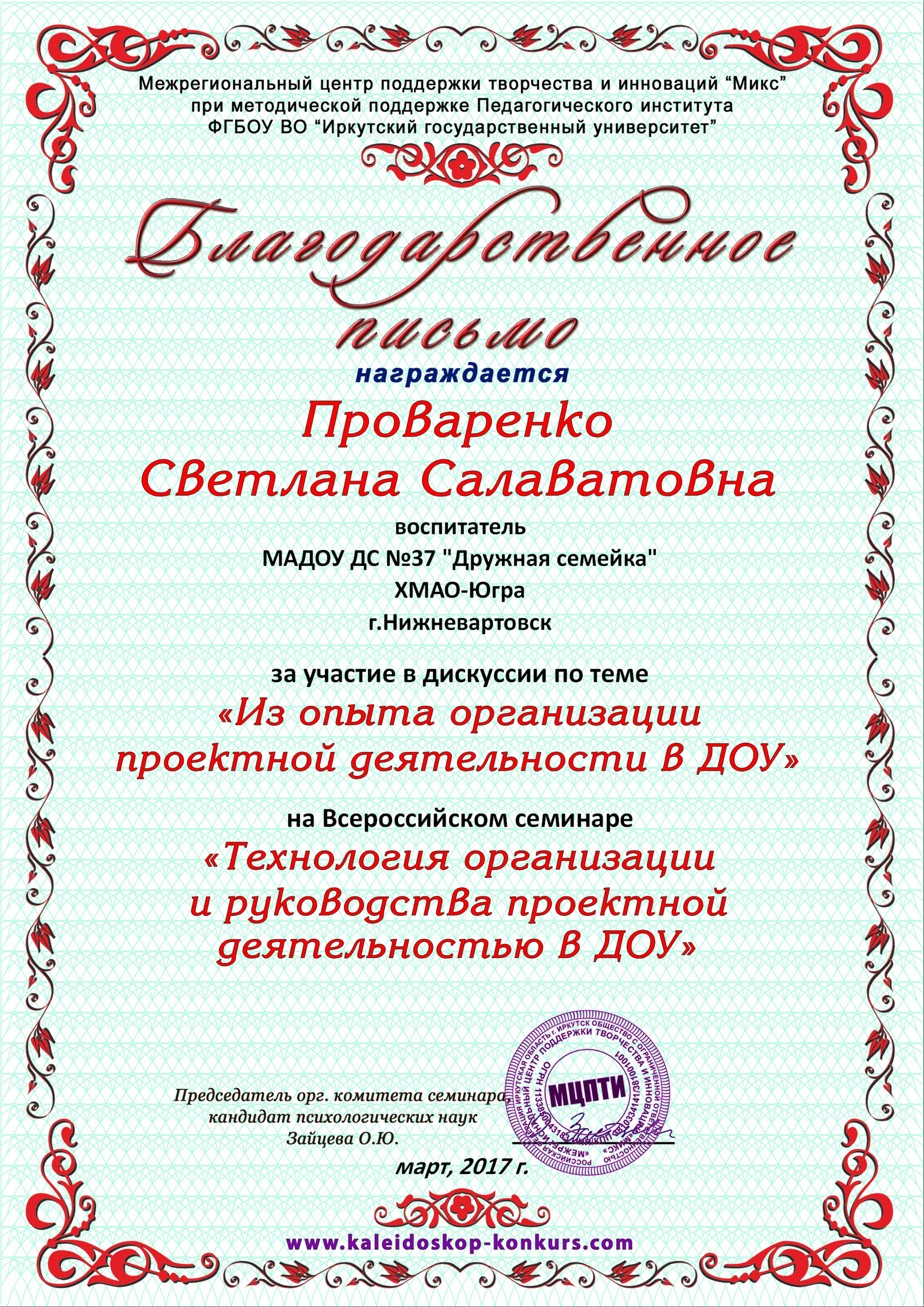 Благодарственное письмо за участие в дискуссии по теме "Из опыта организации проектной деятельности в ДОУ" на Всероссийском научно-методическом семинаре "Технология организации и руководства проектной деятельностью в ДОУ", 2017 год (Просмотр)