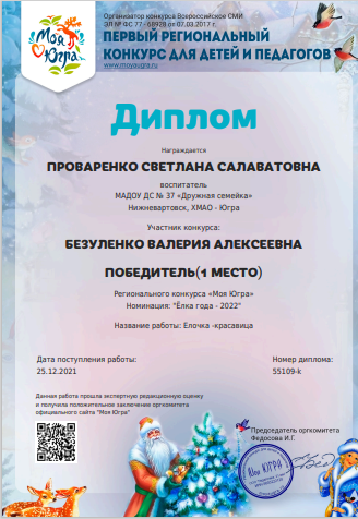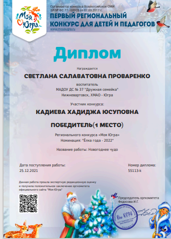 Диплом за подготовку победителя 1 место в региональном конкурсе "Моя Югра" номинация "Ёлка года - 2022", работа "Новый год у ели" (Просмотр)