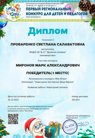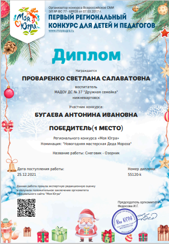 Диплом за подготовку победителя 1 место в региональном конкурсе "Моя Югра" номинация "Новогодняя мастерская Деда Мороза", работа "Снеговик Озорник" (Просмотр)