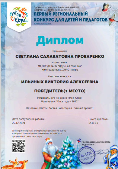 Диплом за подготовку победителя 1 место в региональном конкурсе "Моя Югра" номинация "Ёлка года - 2022", работа "Гостья новогодняя - зимний аромат" (Просмотр)