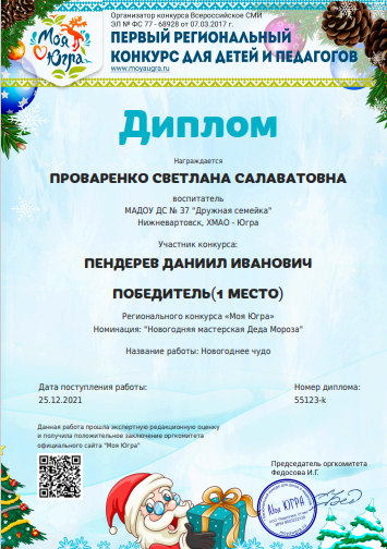 Диплом за подготовку победителя 1 место в региональном конкурсе "Моя Югра" номинация "Новогодняя мастерская Деда Мороза", работа "Новогоднее чудо" (Просмотр)