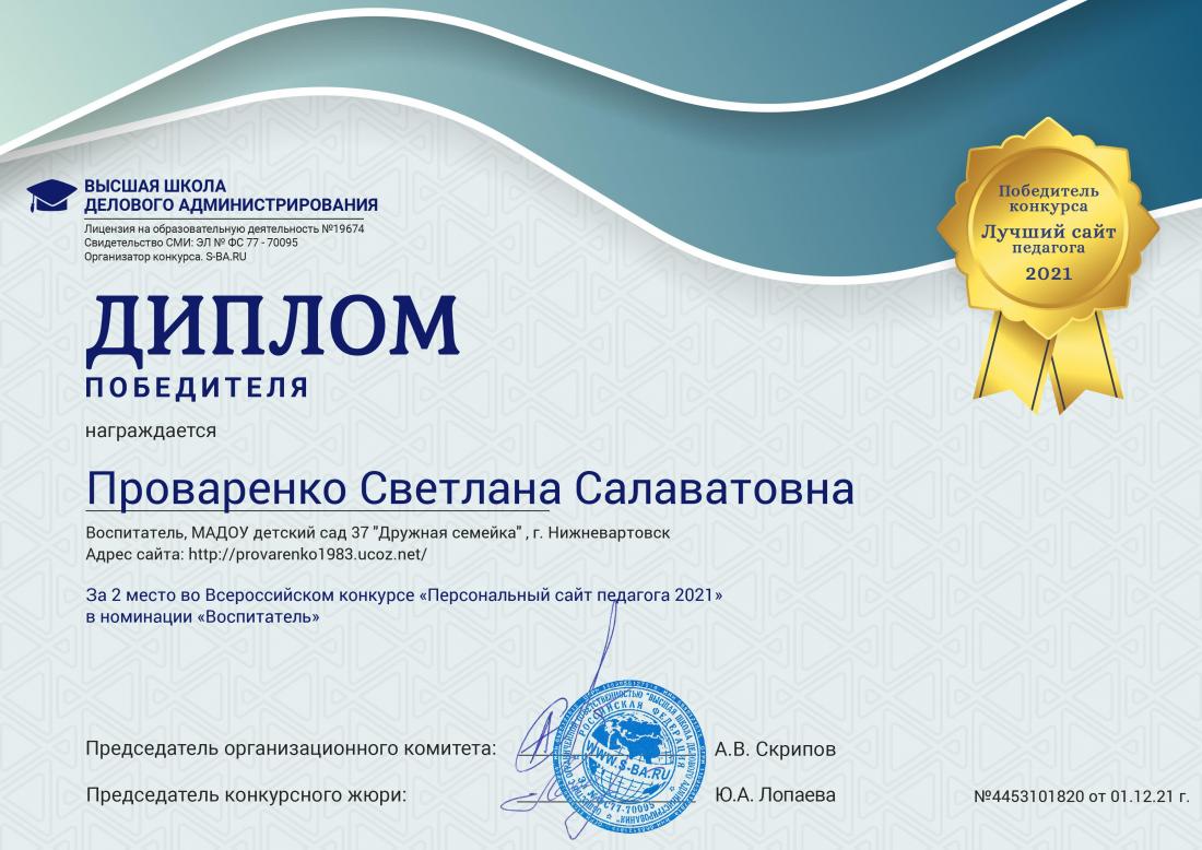 Диплом победителя за 2 место во Всероссийском конкурсе «Персональный сайт педагога 2021» в номинации «Воспитатель» (Просмотр)