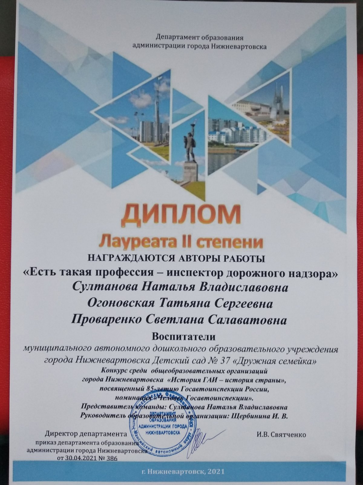 Диплом лауреата 2 степени конкурса среди образовательных организациях города Нижневартовска «Есть такая профессия – инспектор дорожного движения», 2021 год (Просмотр)