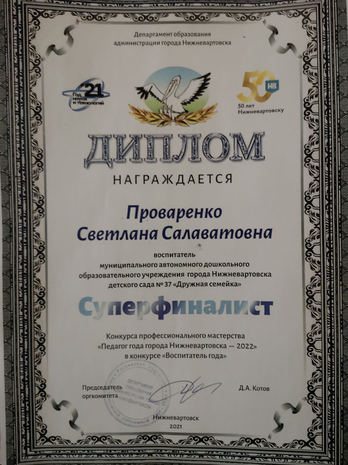 Диплом Суперфиналиста конкурса профессионального мастерства «Педагог года города Нижневартовска – 2022» в конкурсе «Воспитатель года» (Просмотр)