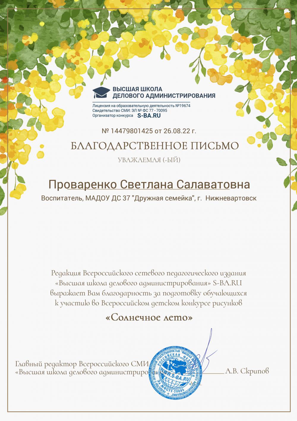 Благодарственное письмо за подготовку воспитанников к участие во Всероссийском детском конкурсе рисунков "Солнечное лето" (Просмотр)