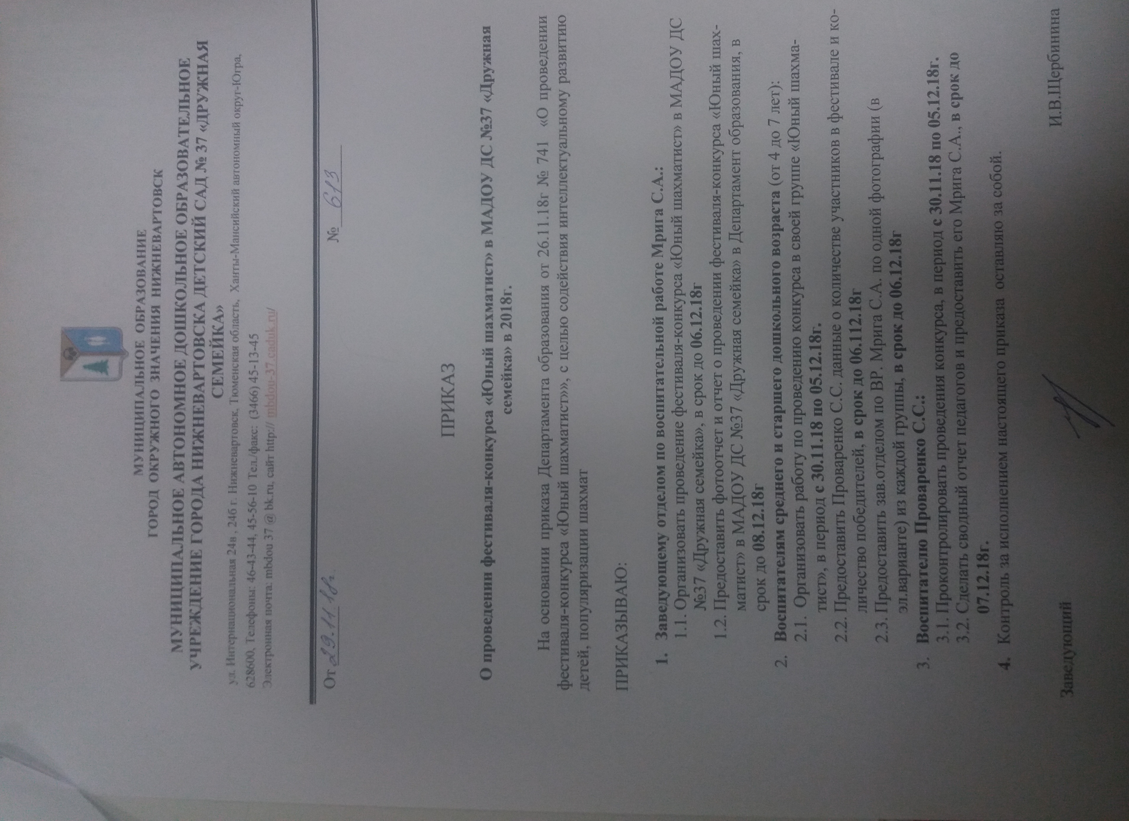 Приказ № 613 от 29.11.2018 "О проведении фестиваля-конкурса "Юный шахматист" в МАДОУ ДС № 37 "Дружная семейка" в 2018 году" (Просмотр)