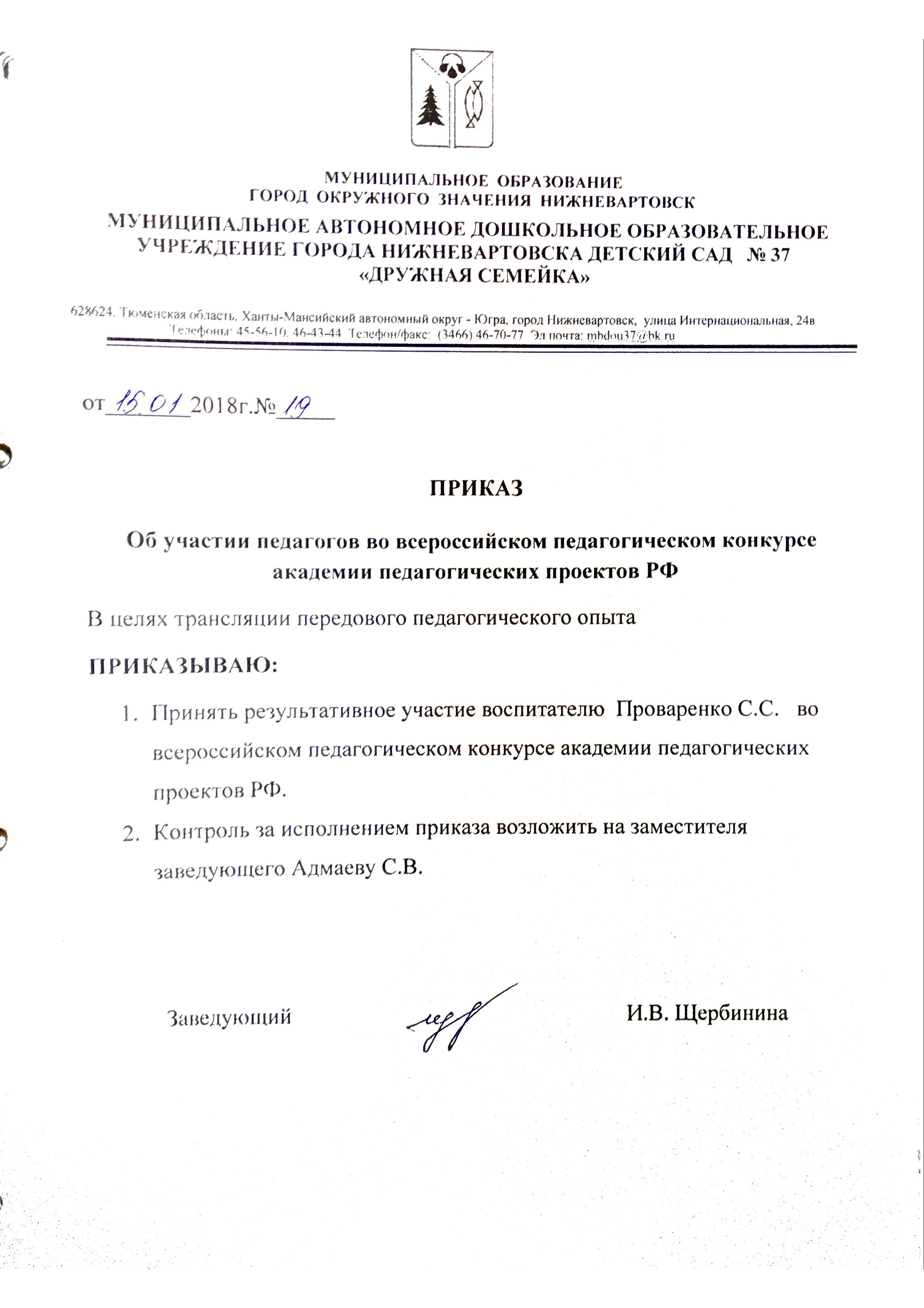 Приказ № 19 от 15.01.2018 "Об участии во всероссийском педагогическом конкурсе академия педагогических проектов РФ" (Просмотр)